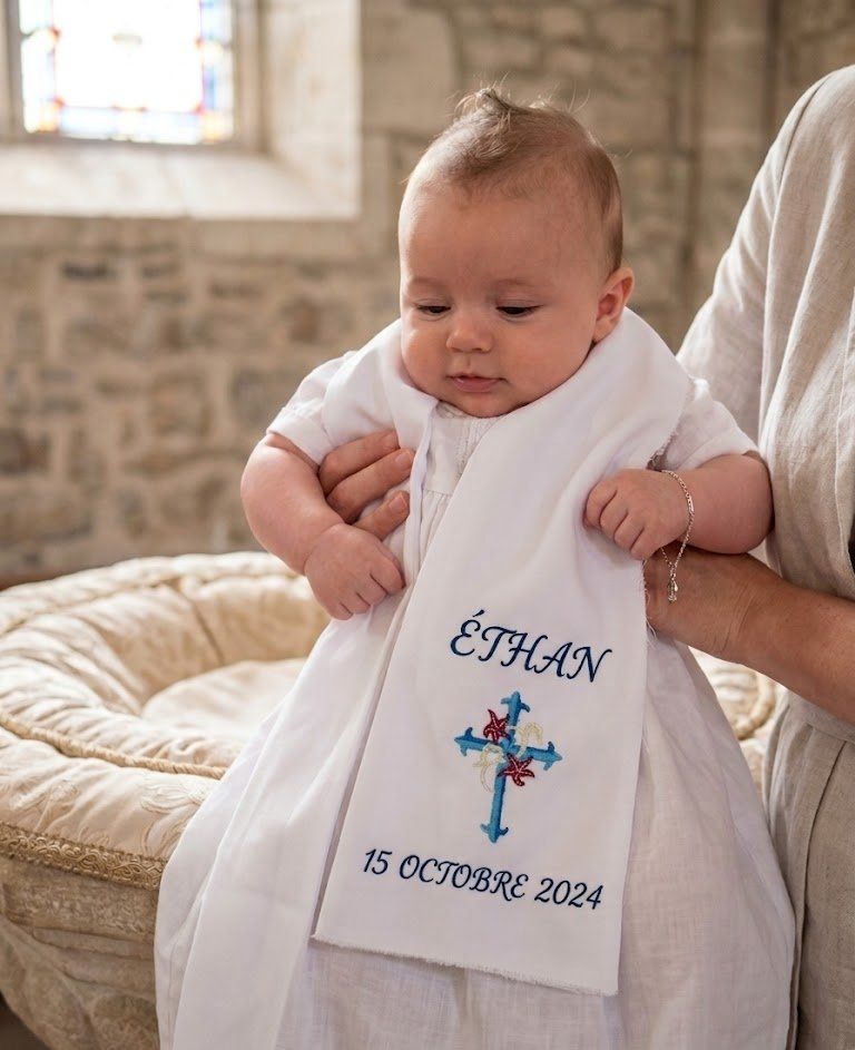 Le baptême est un grand jour, un jour inoubliable. Faites faire votre écharpe dans mon atelier. Fabriquée dans du tissu de qualité, brodez j'y le prénom de votre petit.