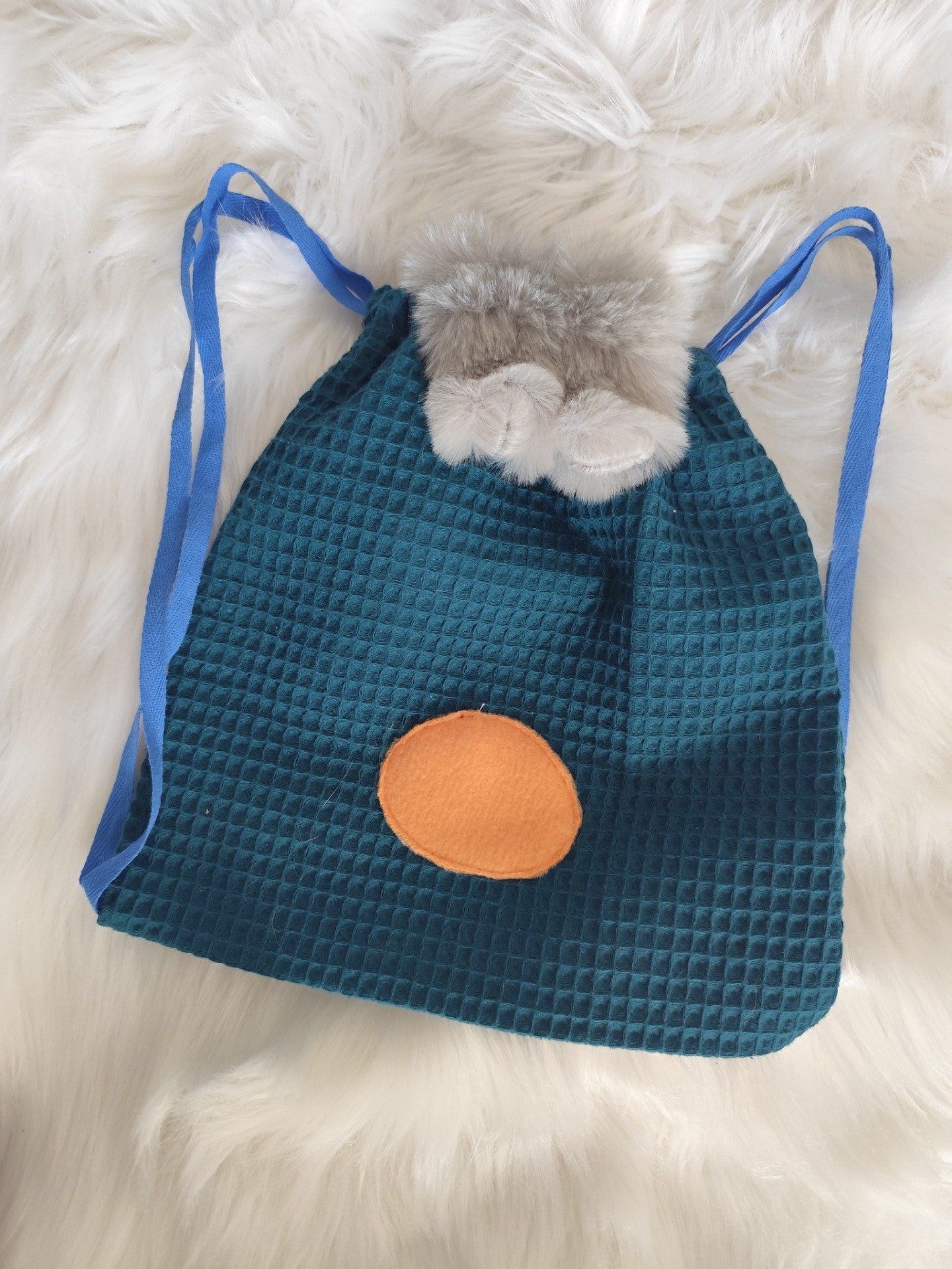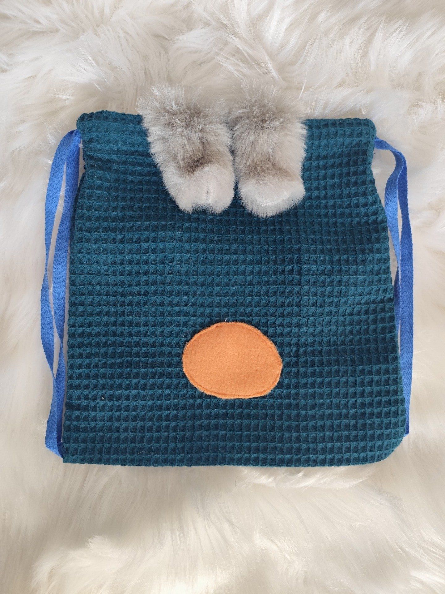 Sac fabriqué dans du tissu nid d'ange et oreilles en fausse fourrure. Très fonctionnel car souple ,léger et s'accroche à la poussette tout comme sur le dos de bébé qui a grandit. les chaussons en maternelle qui trouveront leur place