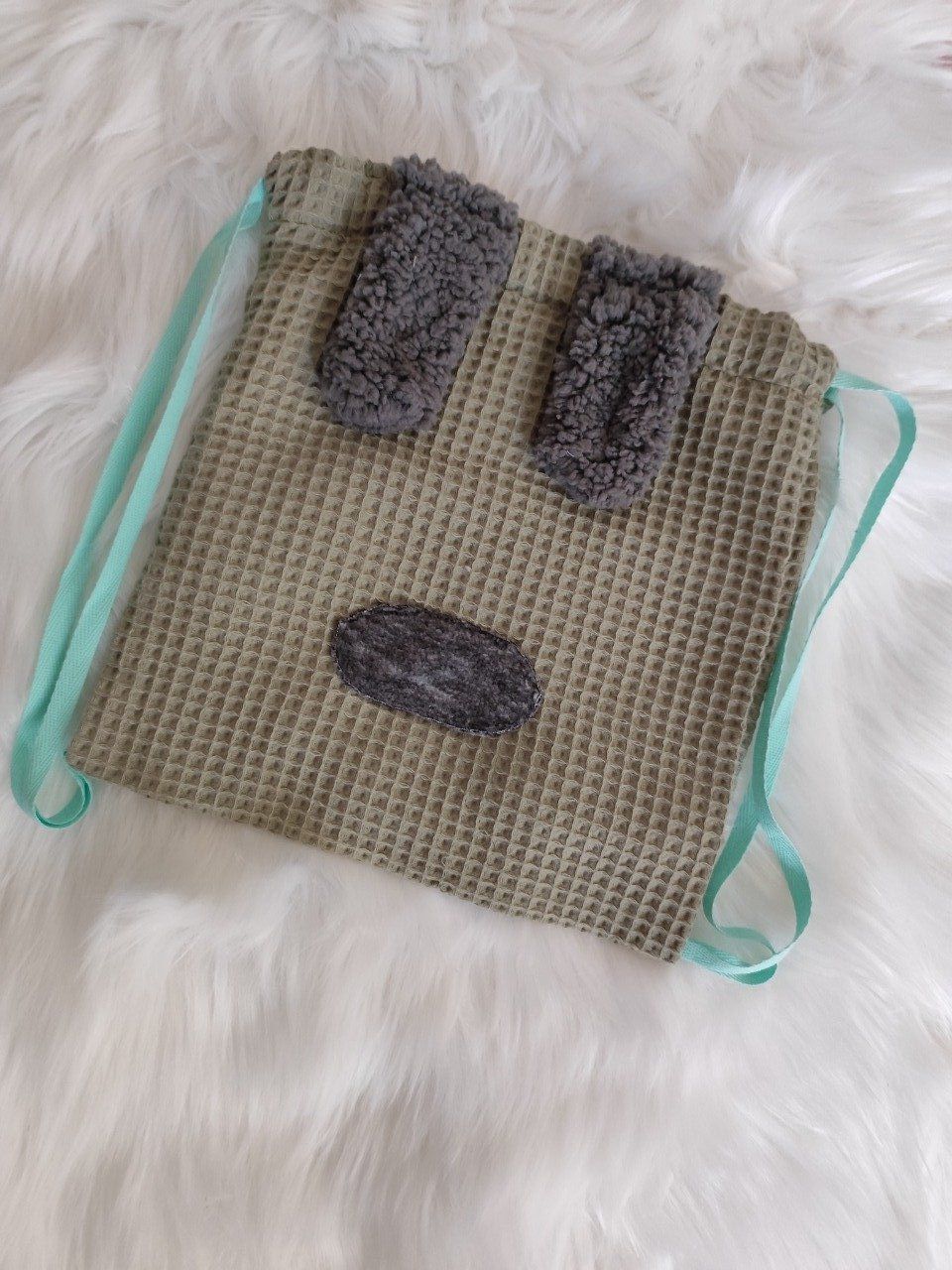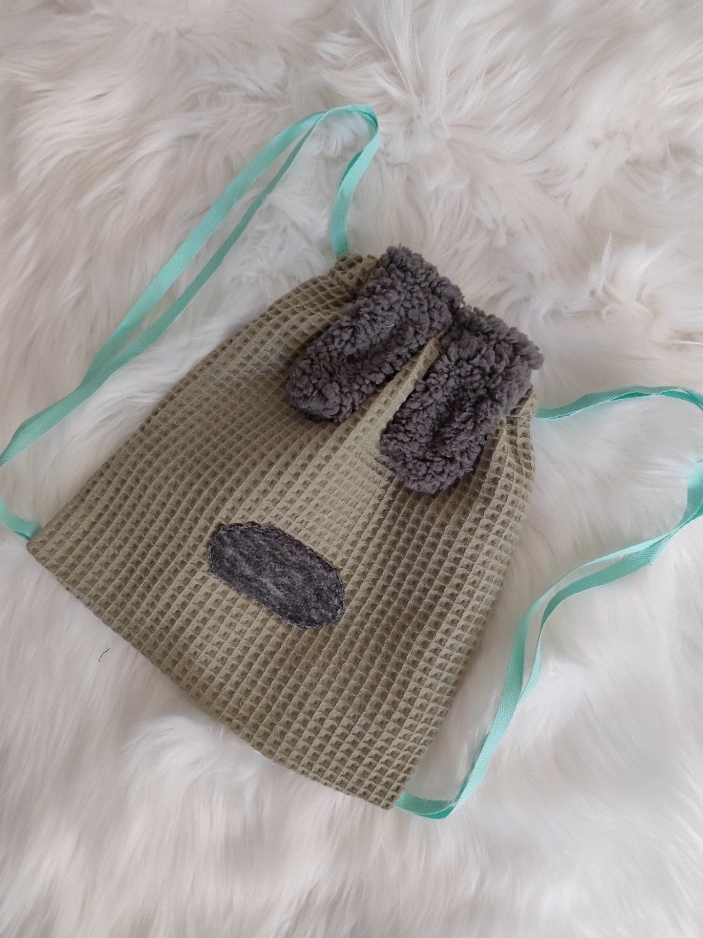 Sac fabriqué dans du tissu nid d'ange et oreilles en douillettes. Très fonctionnel car souple ,léger et s'accroche à la poussette tout comme sur le dos de bébé qui a grandit. les chaussons en maternelle qui trouveront leur place