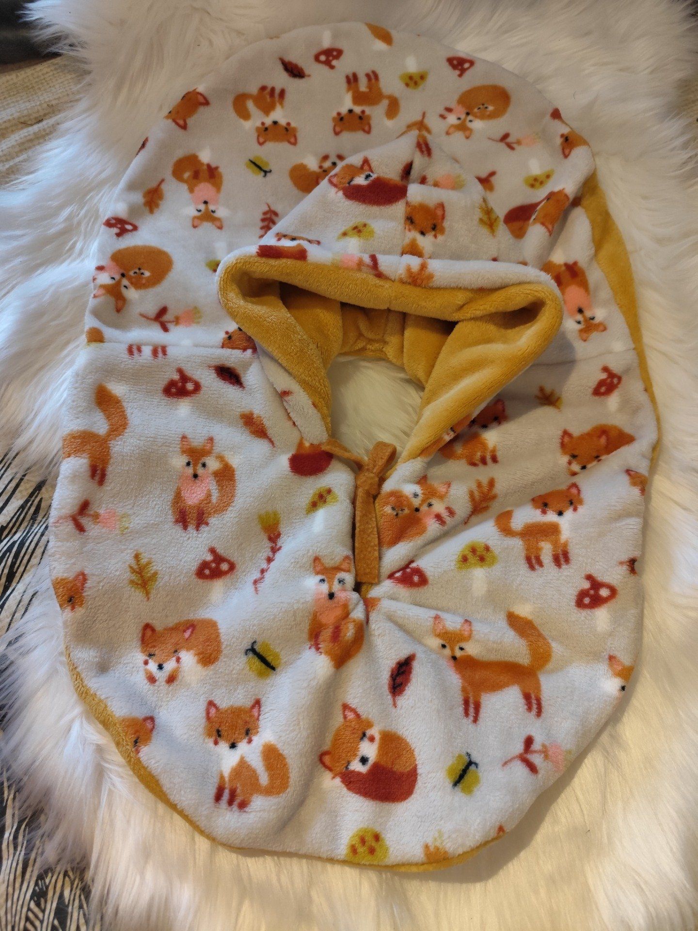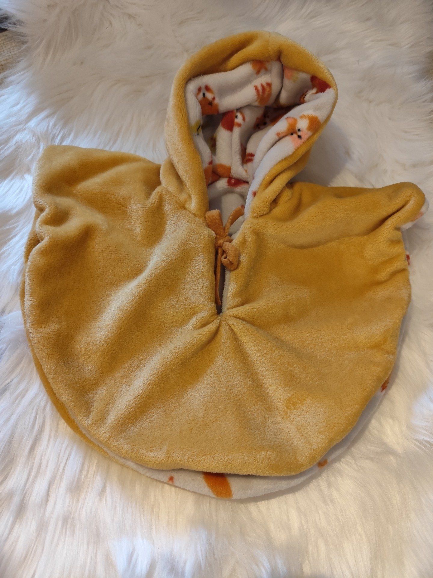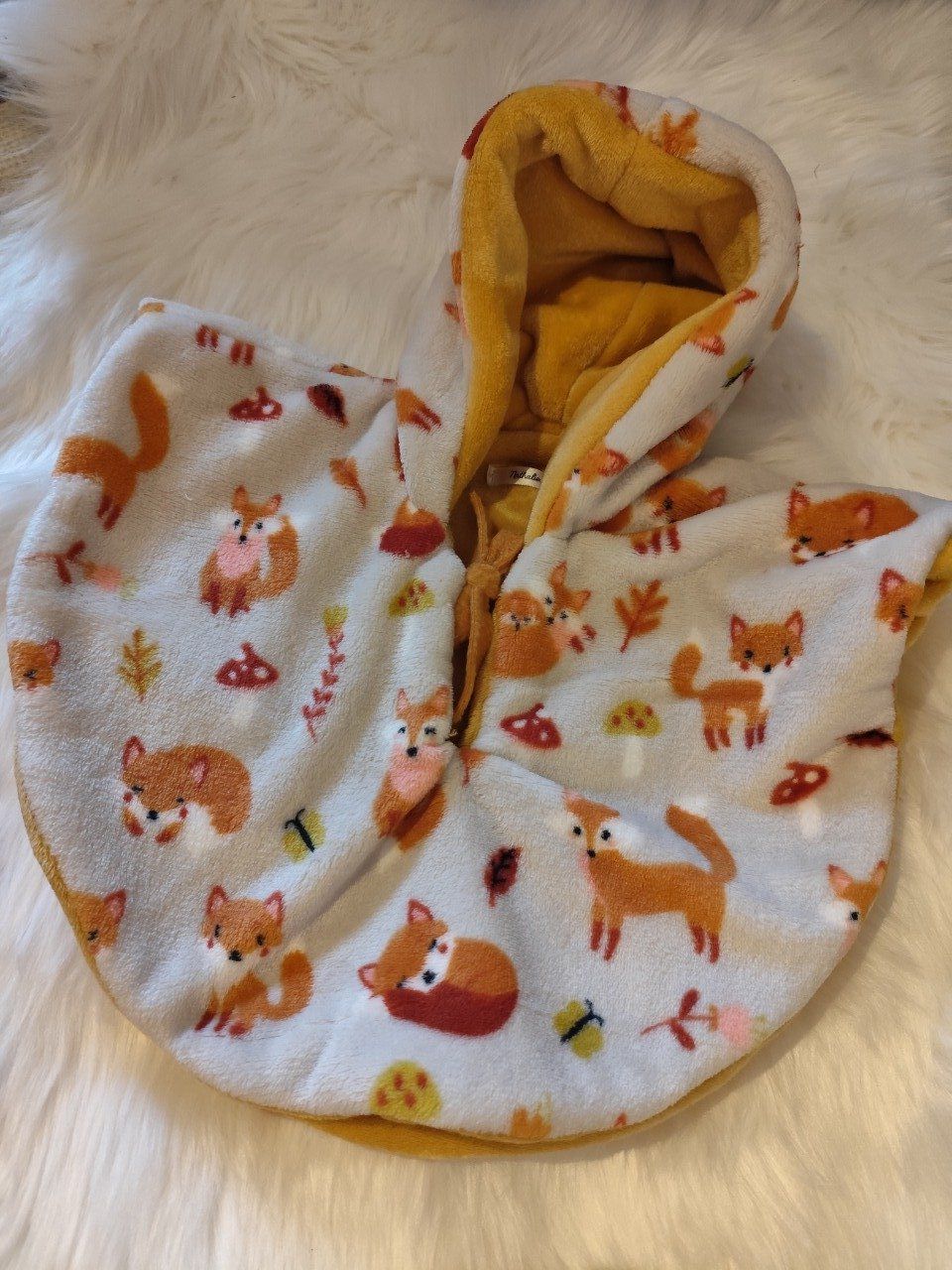 Je me nomme 3 en 1. Je fais couverture de cosy, jolie cape quand on me porte et quand je marche et capeline sur un joli gilet ou sur une veste d'hiver. On peur même me mettre dessus le porte bébé ventral